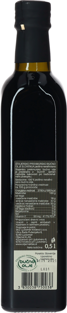 13,50 €13,50 €Bučno olje je slovenska kulinarična posebnost, še zlasti priljubljena na Štajerskem in v Prekmurju.